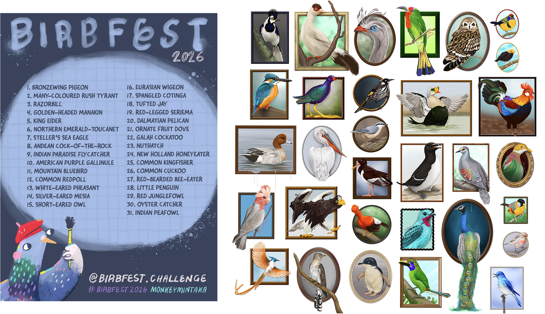 The prompt list, and all my little birbs together (but out of order)!